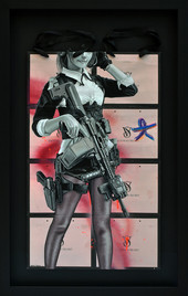 From the ceiling of the exhibition space there were arrangements of bags hanging just above head height. 75 bags from various designer brands in total had each side of it worked over in mixed media. This obvioulsy was accentuating the context of the artwork as it relates to the shopping center above. 2 floors right above were stores such as Gucci and Prada etc. Leaflets were handed out to the staff working in these shops inviting them to the opening night.